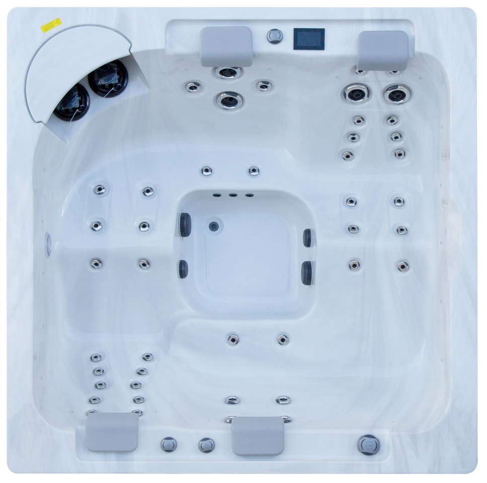 NordicSpa Liv с размером чаши 2,2 x 2,2 м идеально подходит для установки как в помещении, так и на улице. Просторная квадратная чаша с пятью эргономичными подголовниками комфортно вмещает до четырех человек, создавая условия для полноценного отдыха и общения.